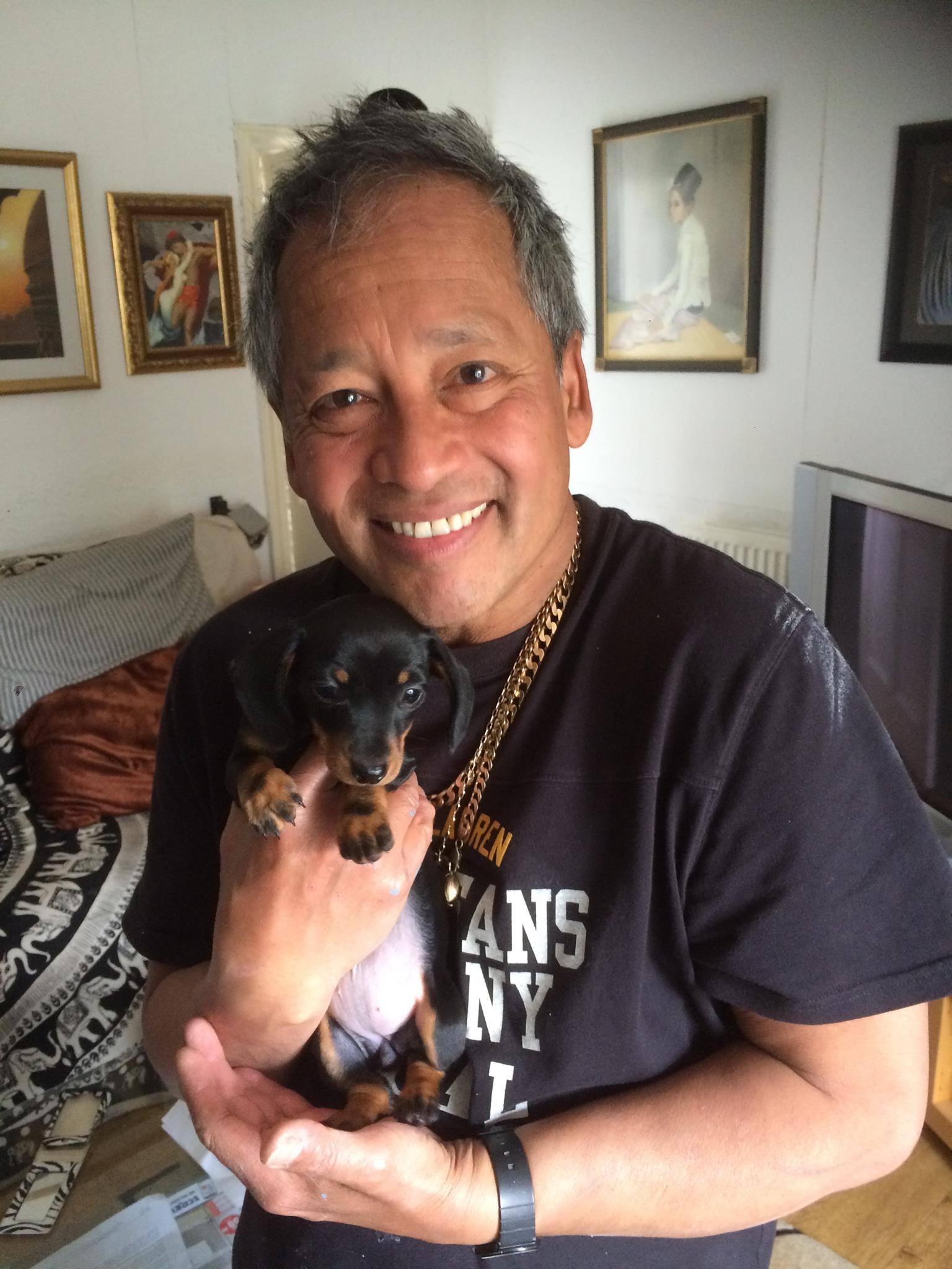 I have various hobbies mainly in Arts and Craft and specialise classically painting Ostrich Eggs. As you know I have a penchant for Jokes covering a wide array of subjects and pride myself in telling jokes on any letter of the alphabet Rude or otherwise! I have attached a recent photograph holding my son's new puppy
